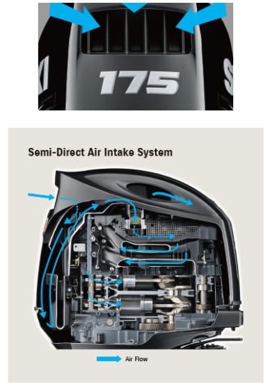 Underneath the modern upswept engine cover are a number of function-focused features that enhance engine performance. Both the DF175AP and DF150AP are equipped with a Semi-Direct Air Intake system that brings cooler air directly into the multi-stage induction module. Engines that breathe cooler air can operate more efficiently resulting in greater acceleration and top-end speed.Covers also have ports on the top that allow the rotating flywheel to push warm air inside of the cover to the outside helping to reduce temperature inside of the cover.