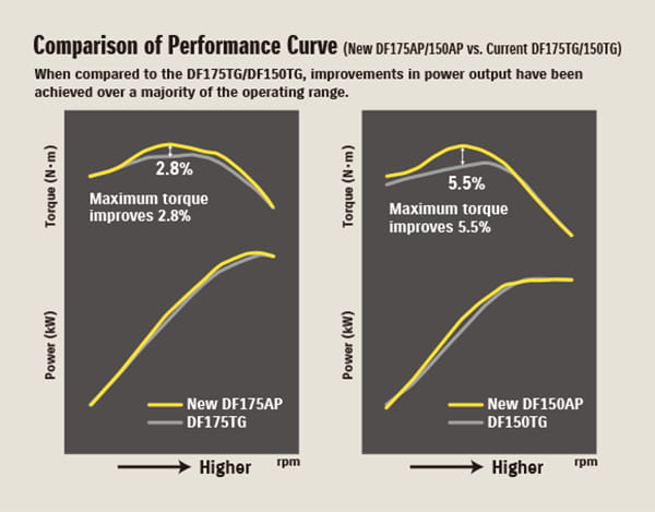 Both the DF175AP and DF150AP incorporate a combination of soft type and high thrust rubber mounts on both upper and lower mounts to reduce engine vibration and provide stable operation. Soft type rubber mounts are used to absorb vibrations generated in the idling through 2,000 rpm range while high thrust rubber mounts deliver stable operation under high loads increasing power and performance.