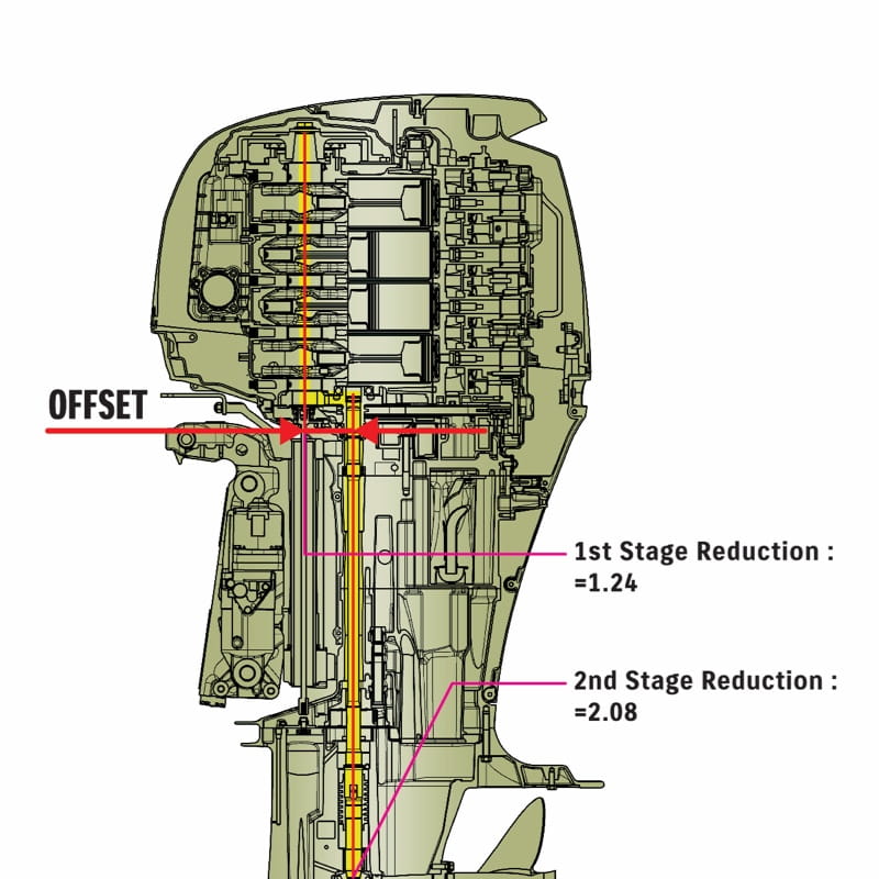 That’s due in part to our proven offset driveshaft system. This design places the crankshaft in front of the driveshaft through the use of intermediate gear reduction. In addition to providing an increase in power performance and adding to the compactness of the outboard, this system moves the outboard’s centre of gravity forward, resulting in better weight distribution and balance, better directional stability, and less vibration.