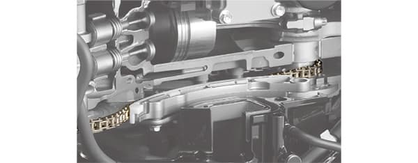 The timing chain runs in an oil-bath so it never needs lubricating, and is equipped with an automatic hydraulic tensioner so it remains properly adjusted at all times.